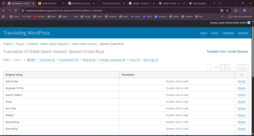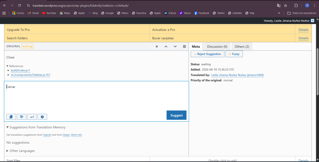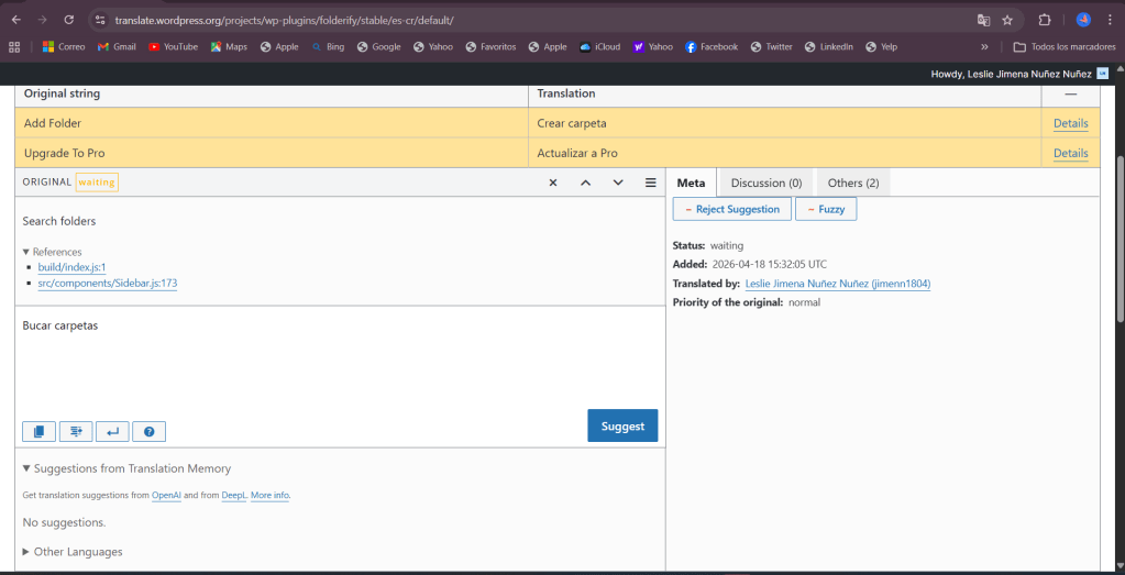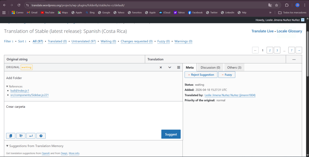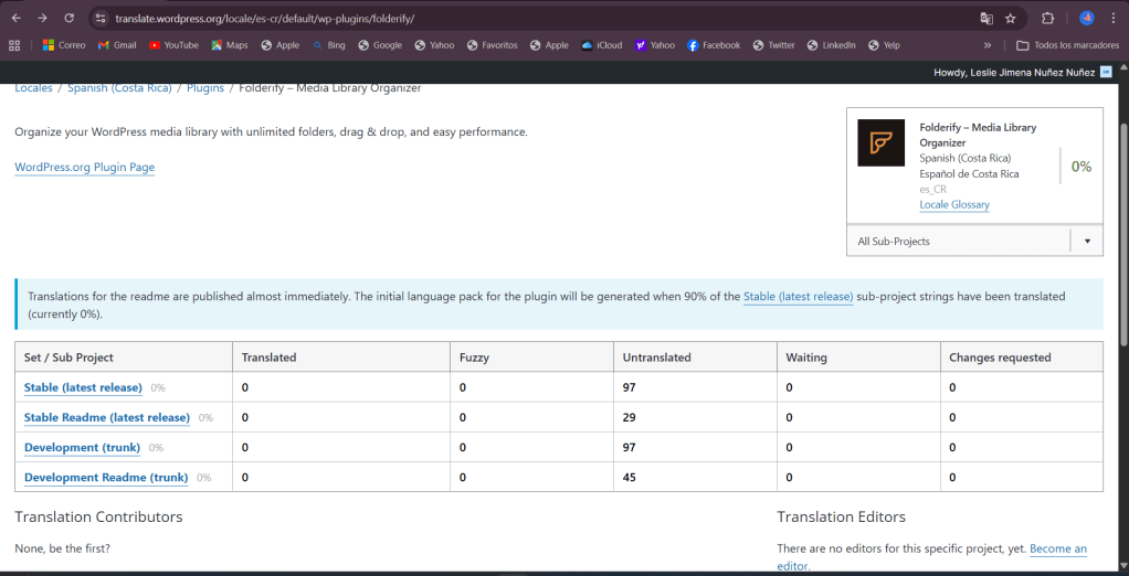 Para ello, seleccioné el plugin Folderify – Media Library Organizer, el cual no contaba con traducciones al español de Costa Rica (es_CR), presentando un 0% de avance. Esto representó una oportunidad importante para realizar aportes iniciales dentro de este proyecto.