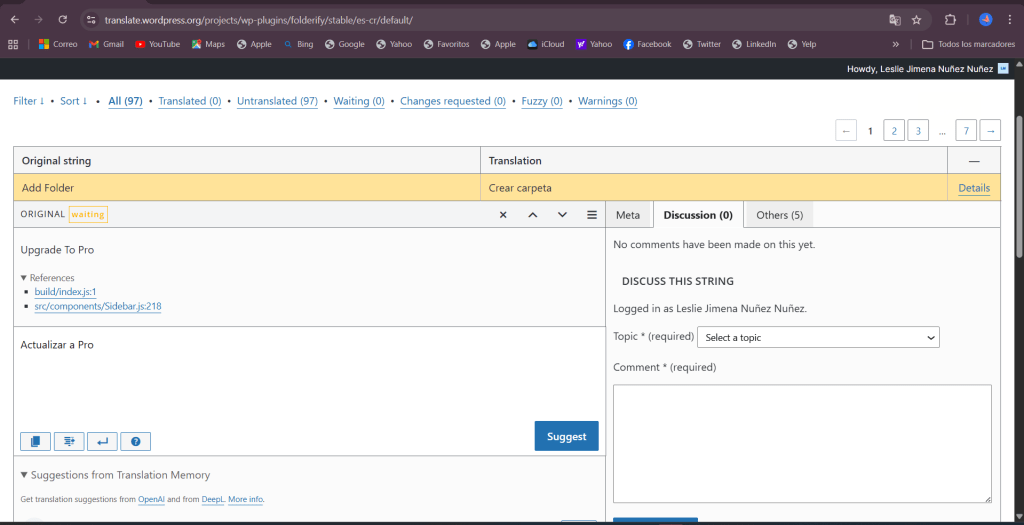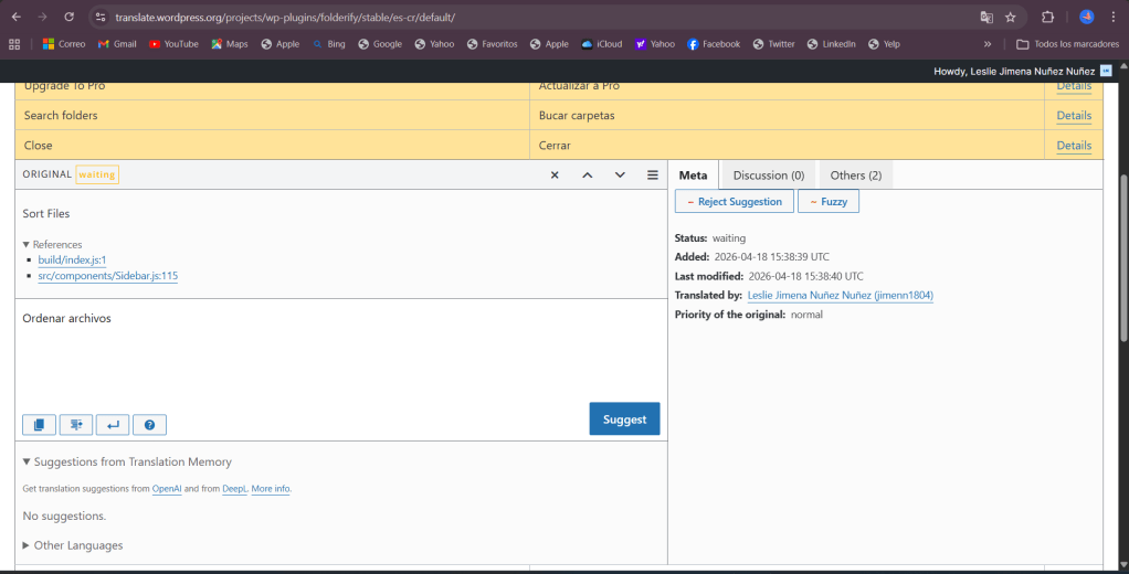 Cada una de estas traducciones fue enviada mediante el botón Suggest, quedando en estado waiting, lo que indica que están pendientes de revisión por parte de los editores.